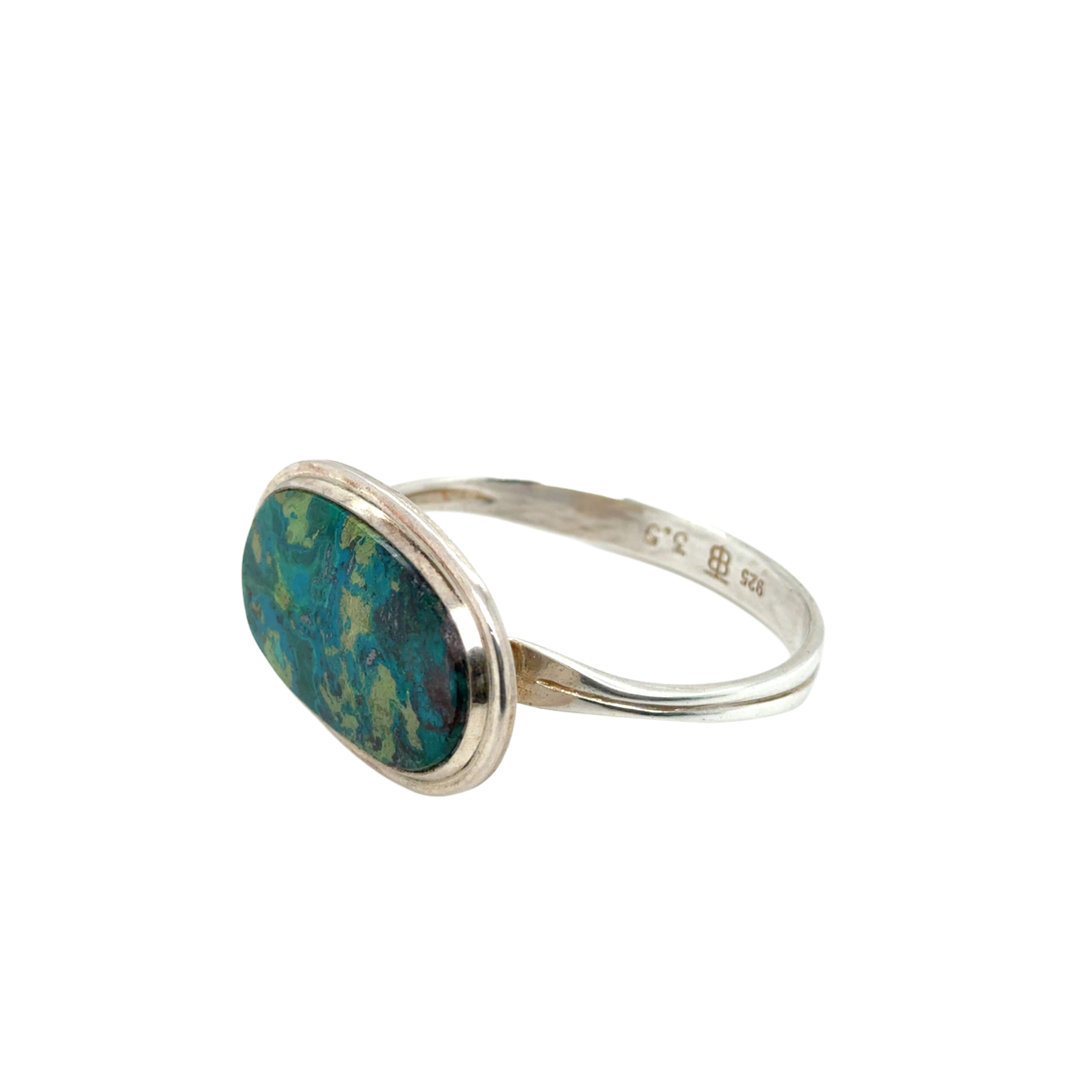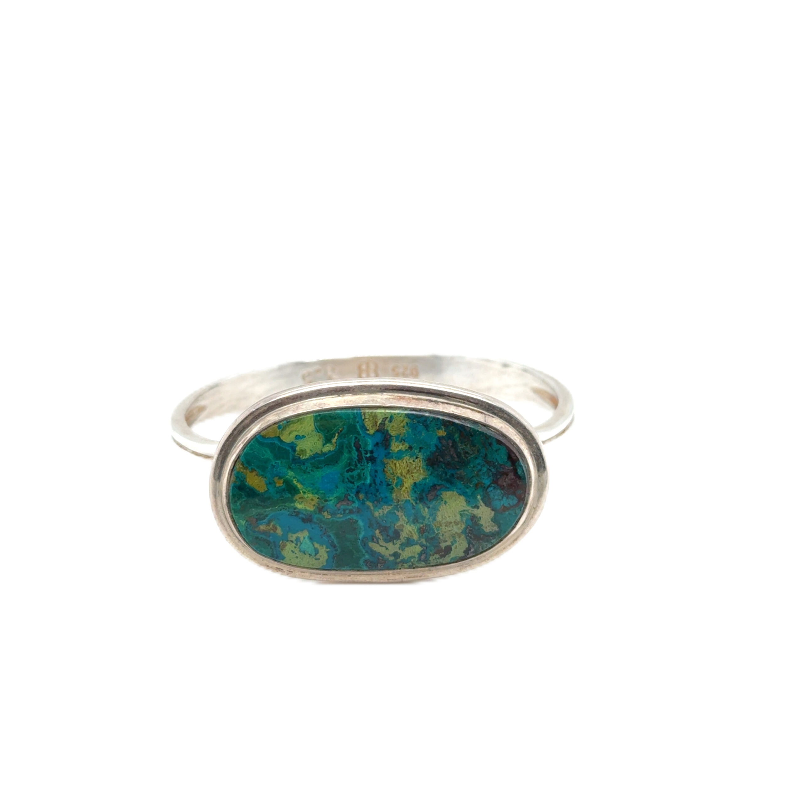 Chrysocolla bracelet top set in a sterling silver bezel.