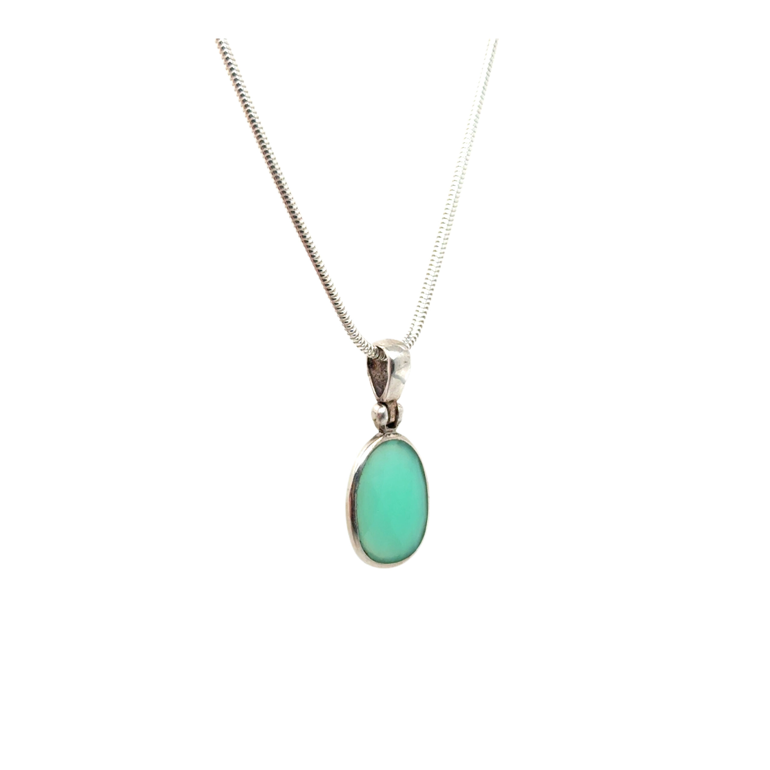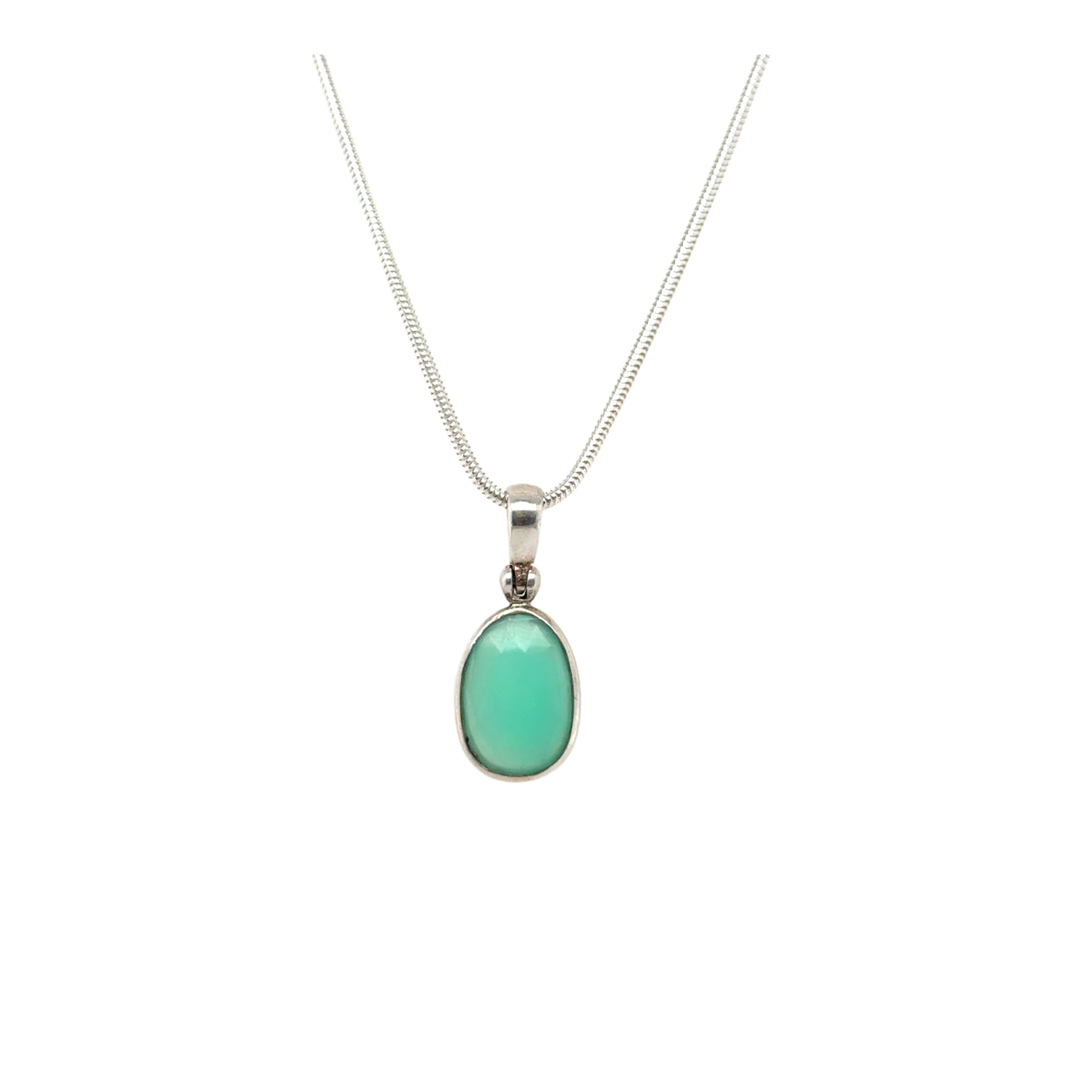 Faceted rose cute chrysoprase set in a sterling silver bezel with a sterling silver bail.
