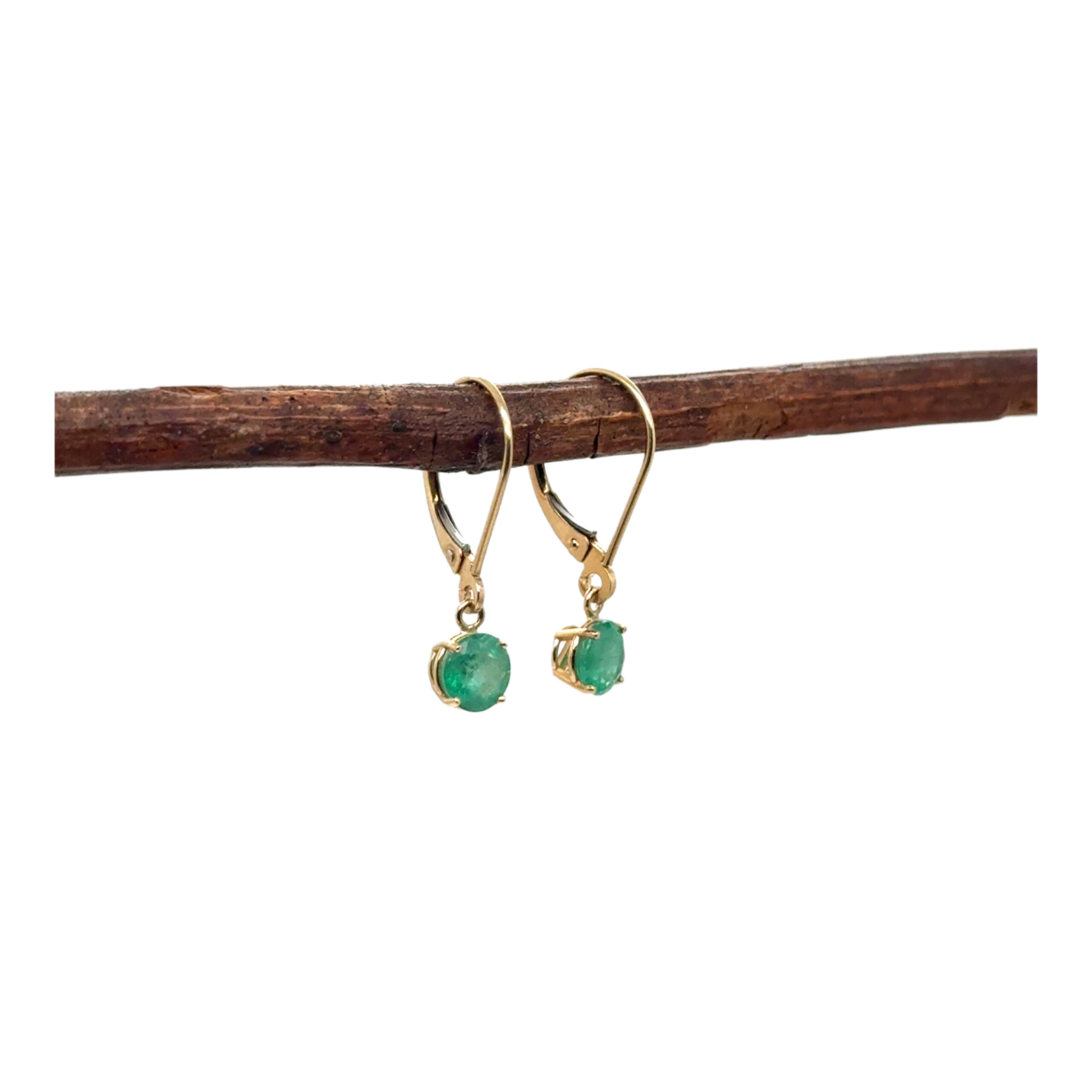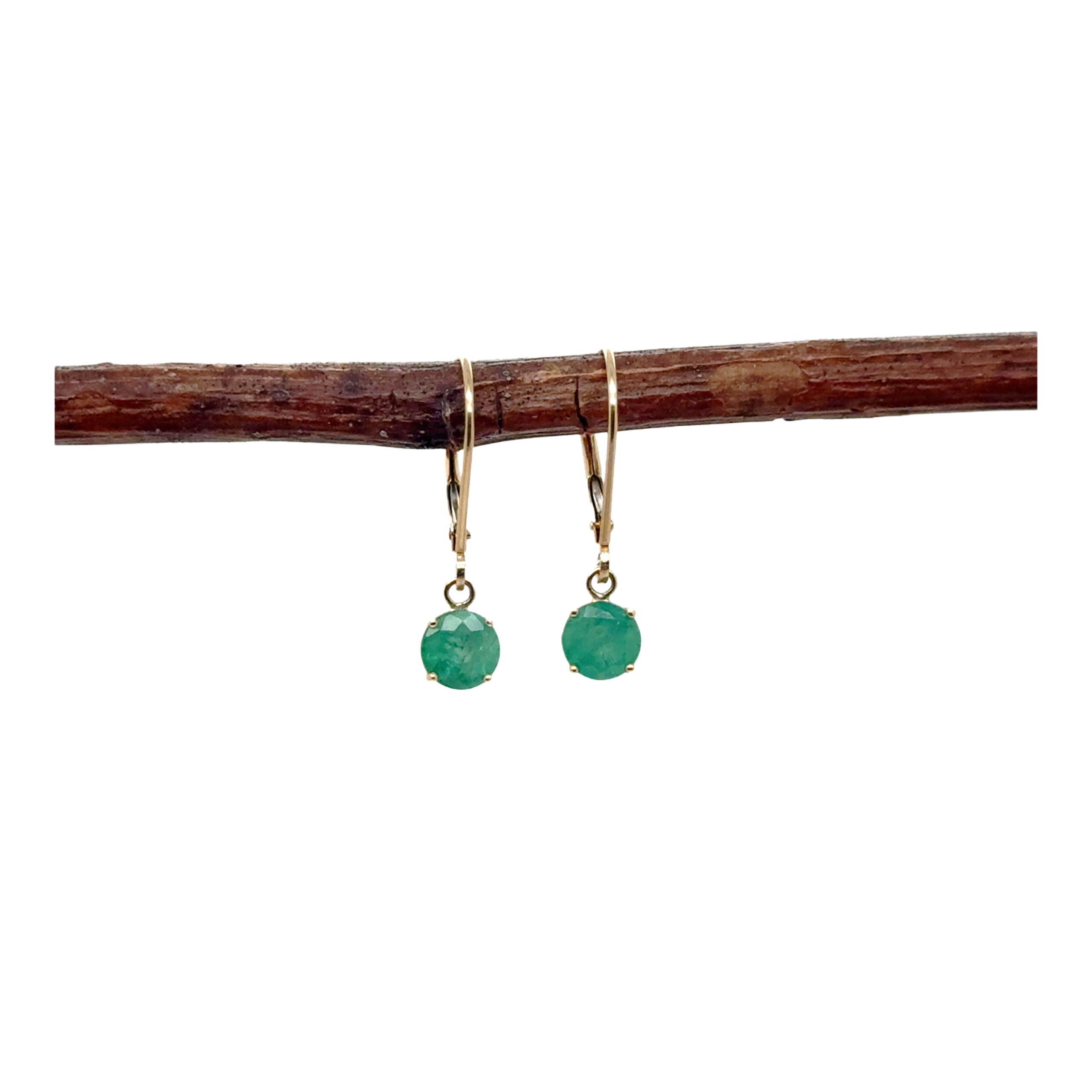 1.15ct round faceted emerald earrings set in 14k yellow gold baskets on 14k yellow gold lever back wires.