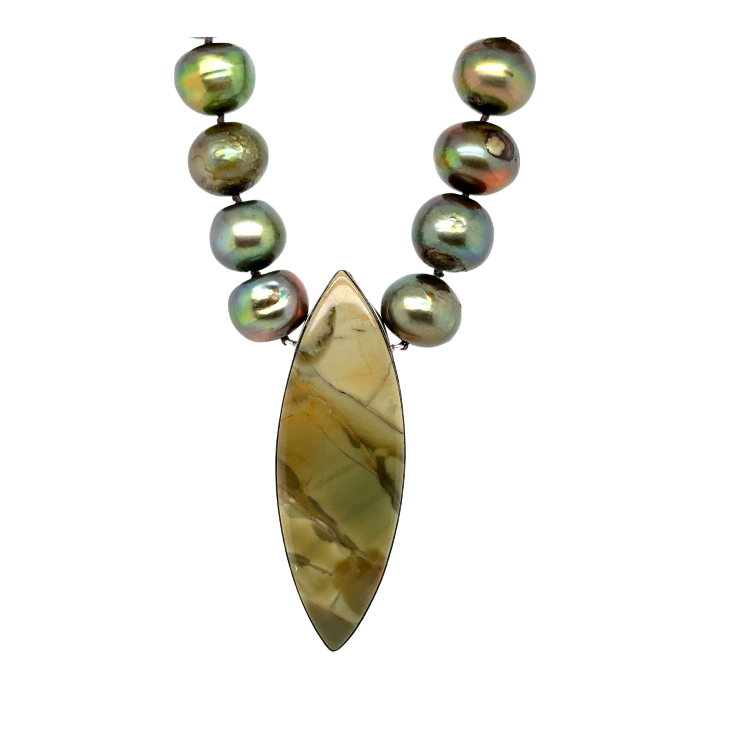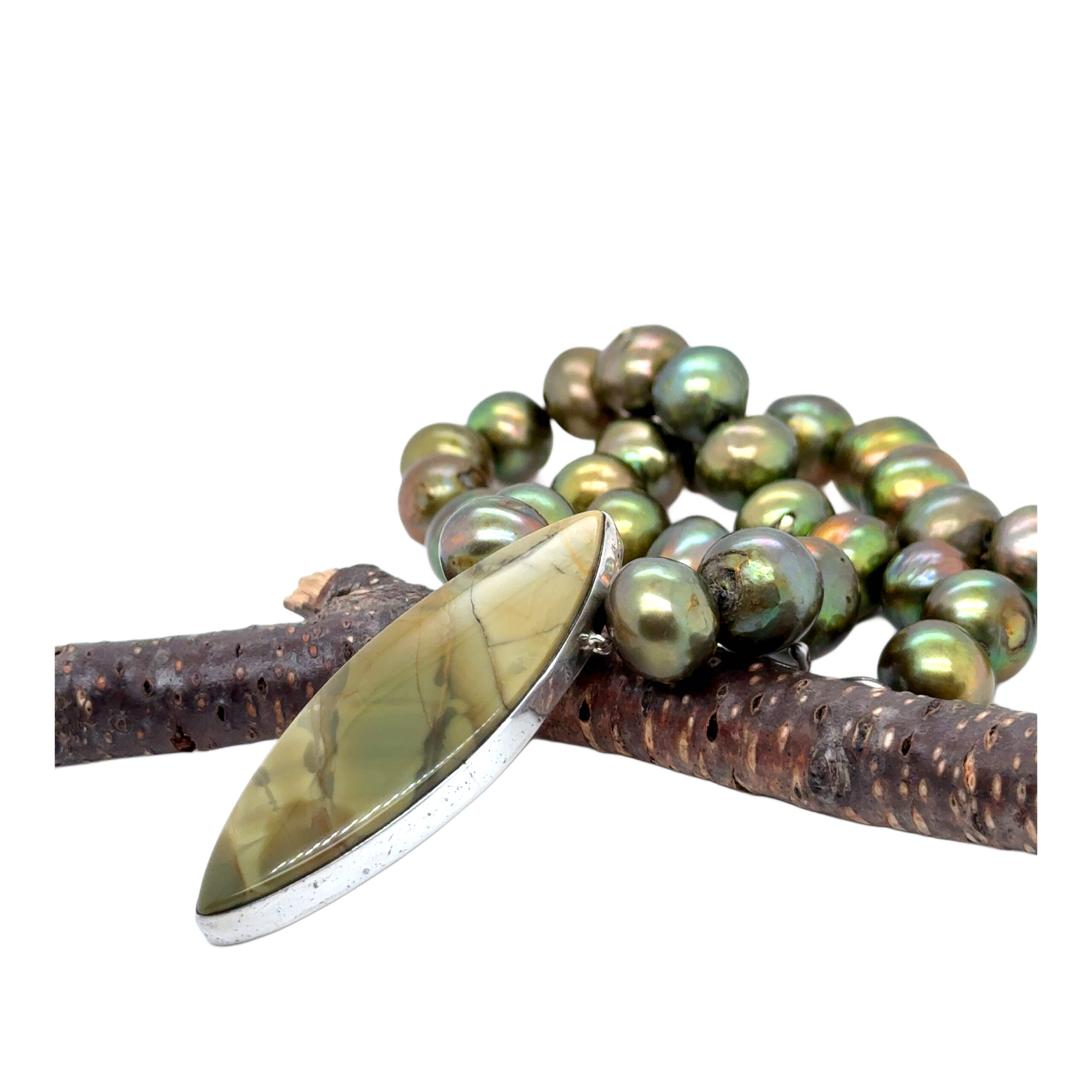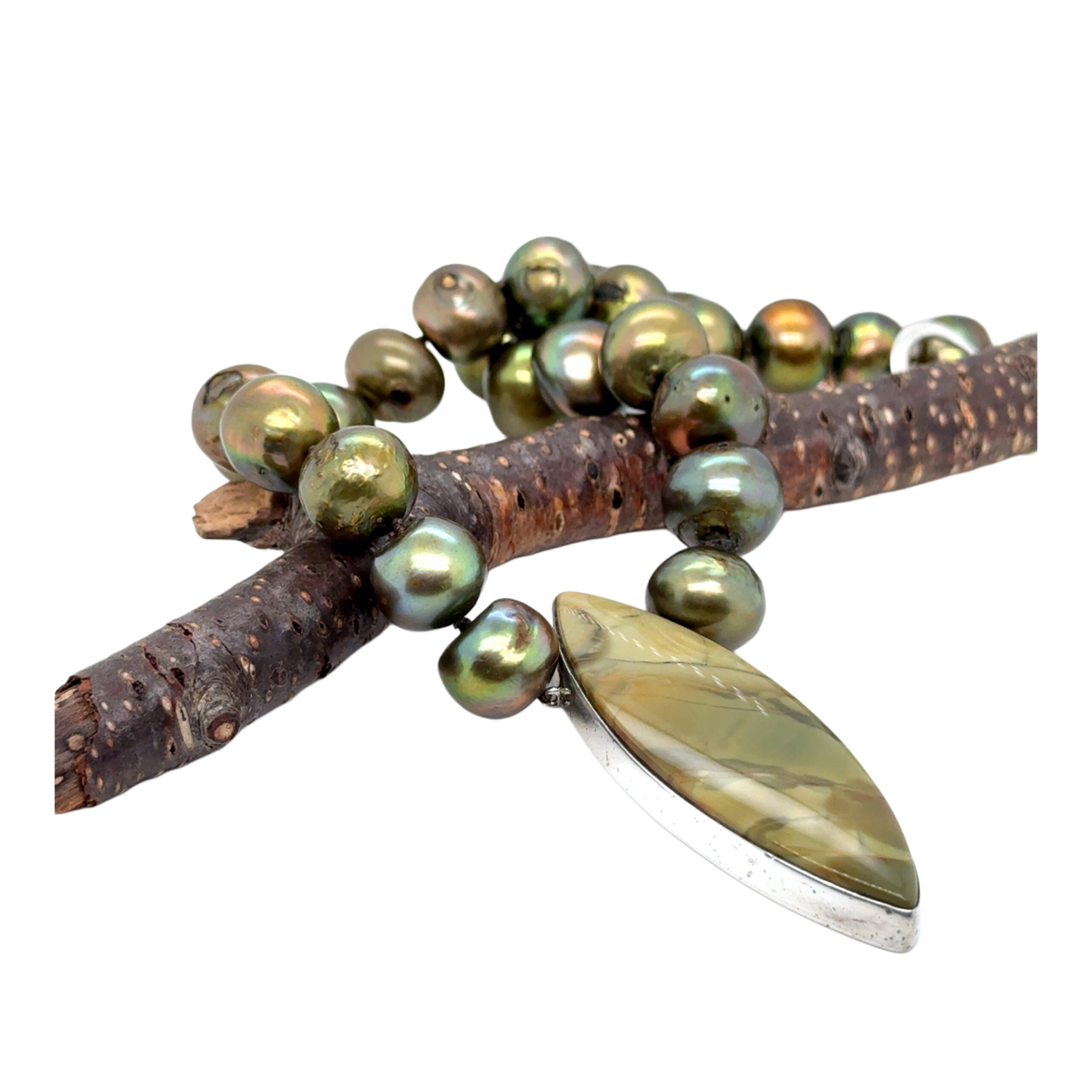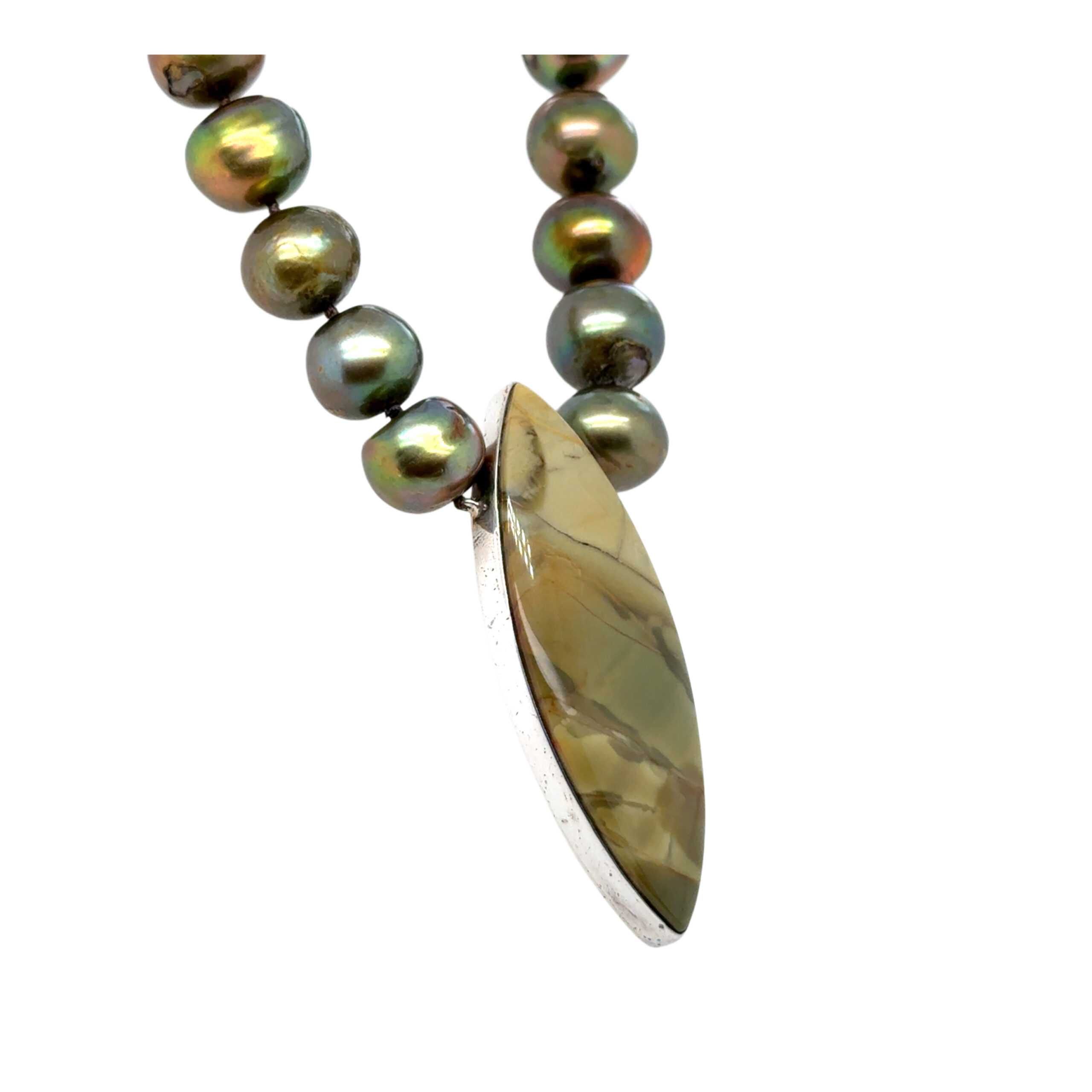 Dyed green cultured fresh water pearls with a marquis shape jasper center stone set in sterling silver.