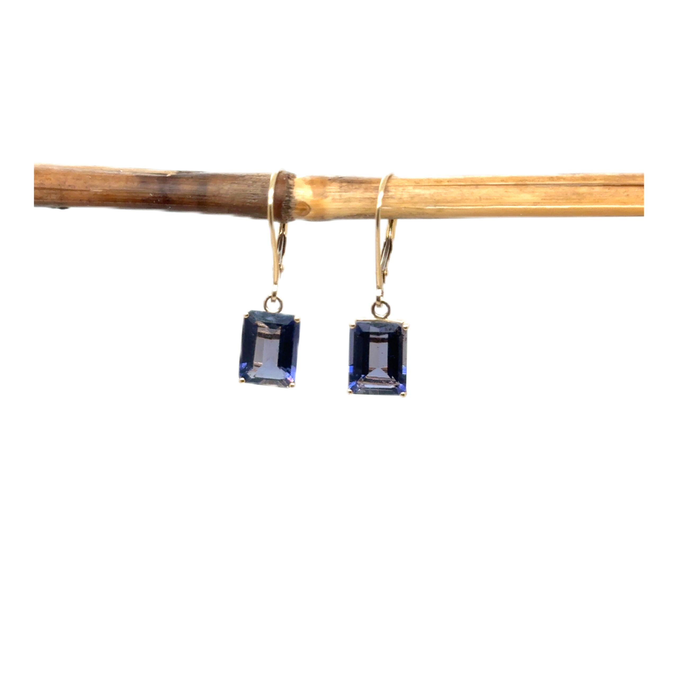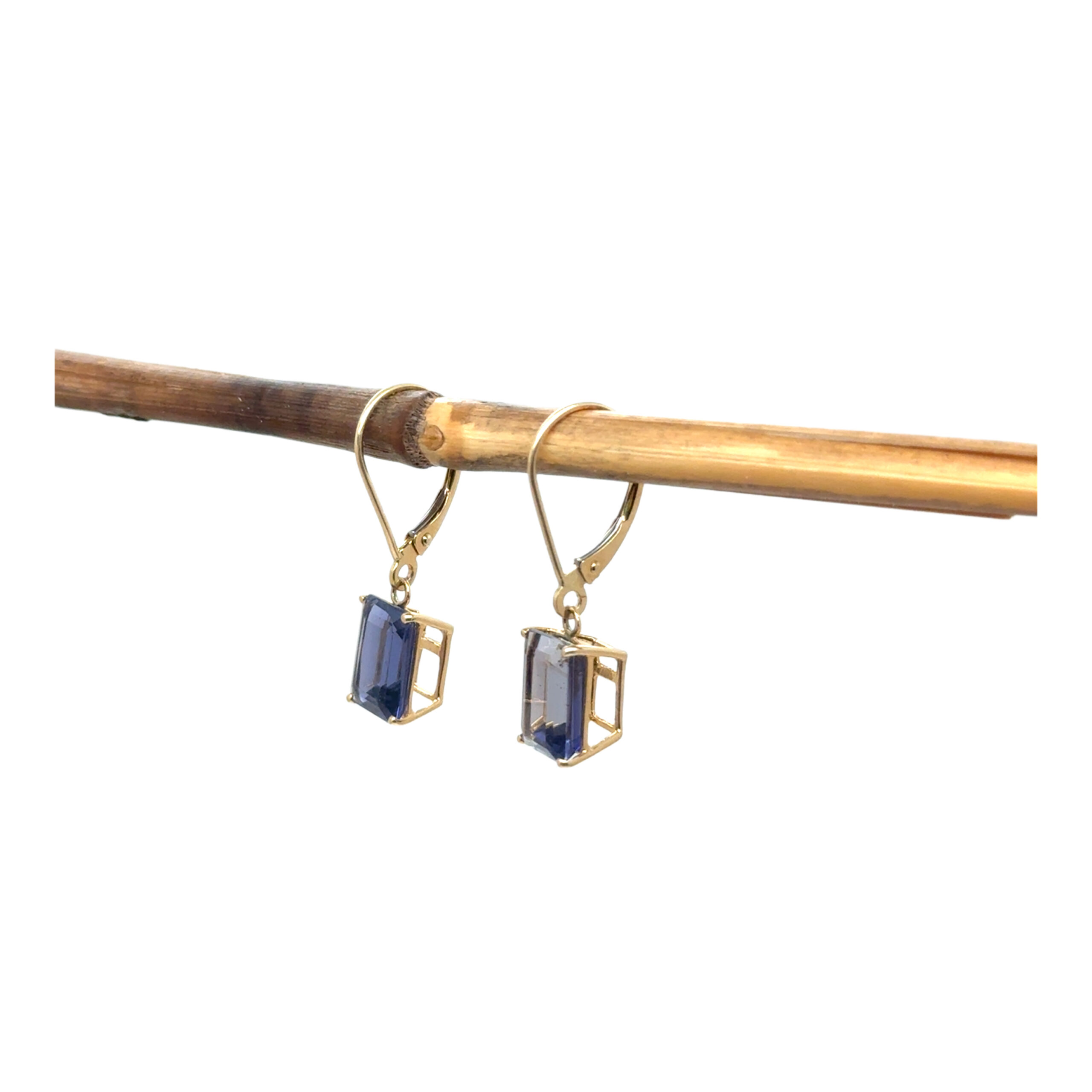 3.70ct emerald cut iolite earrings set in 14k yellow gold with yellow gold lever back style wires.
