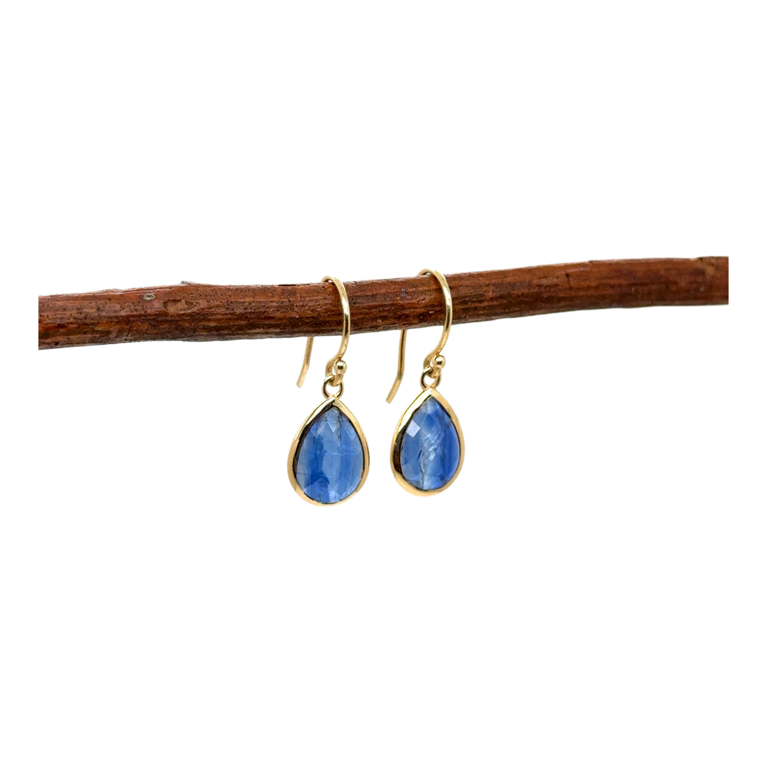 3.75ct pear shape kyanite set in 18k yellow gold bezel wire with 18k yellow gold French style wires.