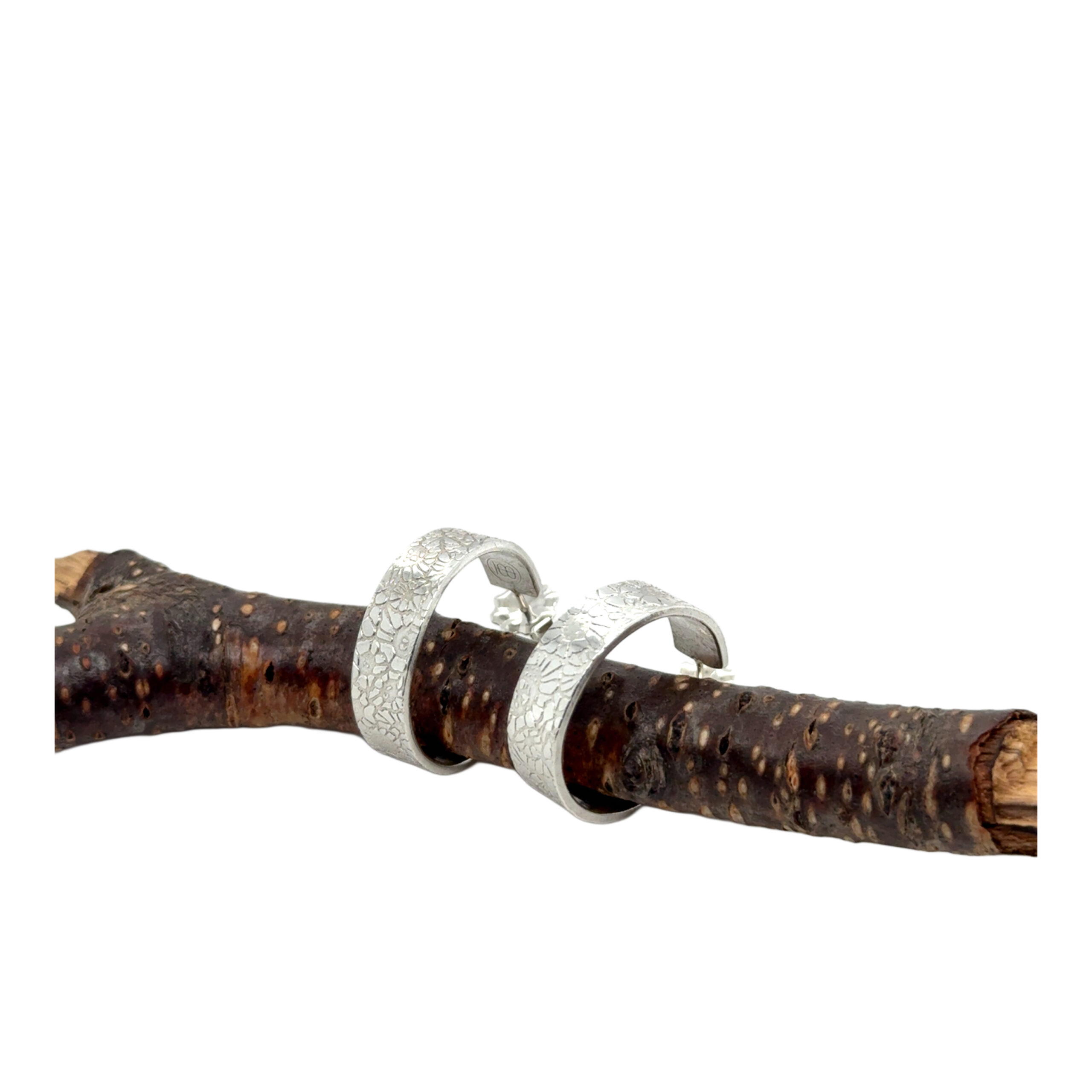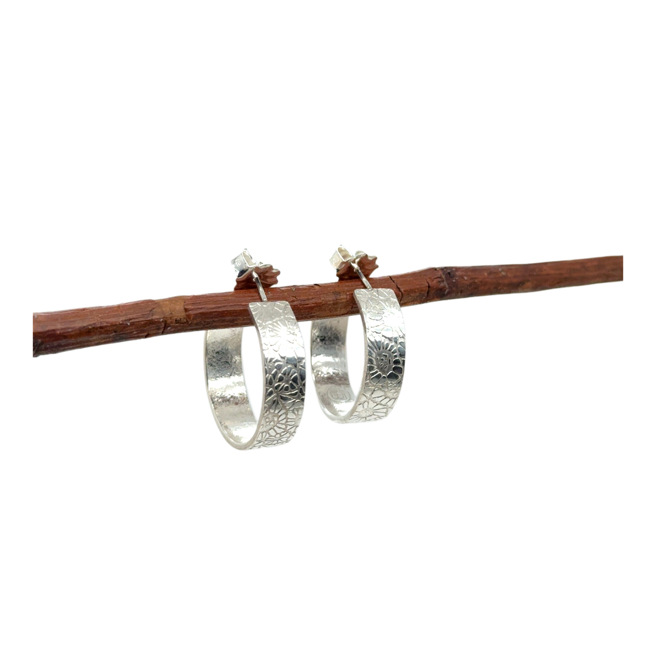 Sterling silver embossed Petoskey pattern hoop earrings.