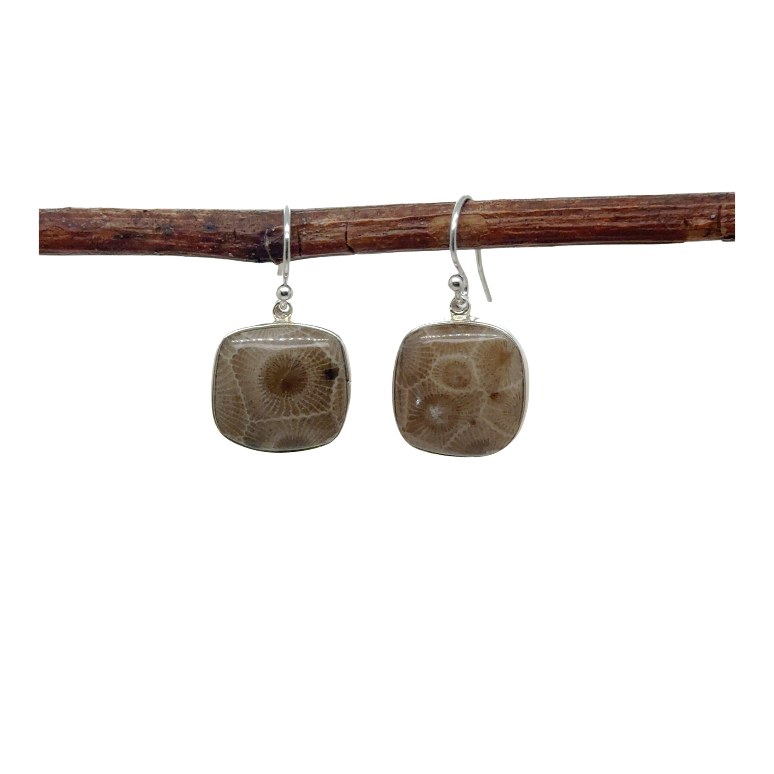 Square shape Petoskey stones set in a sterling silver bezel with sterling silver French style wires.