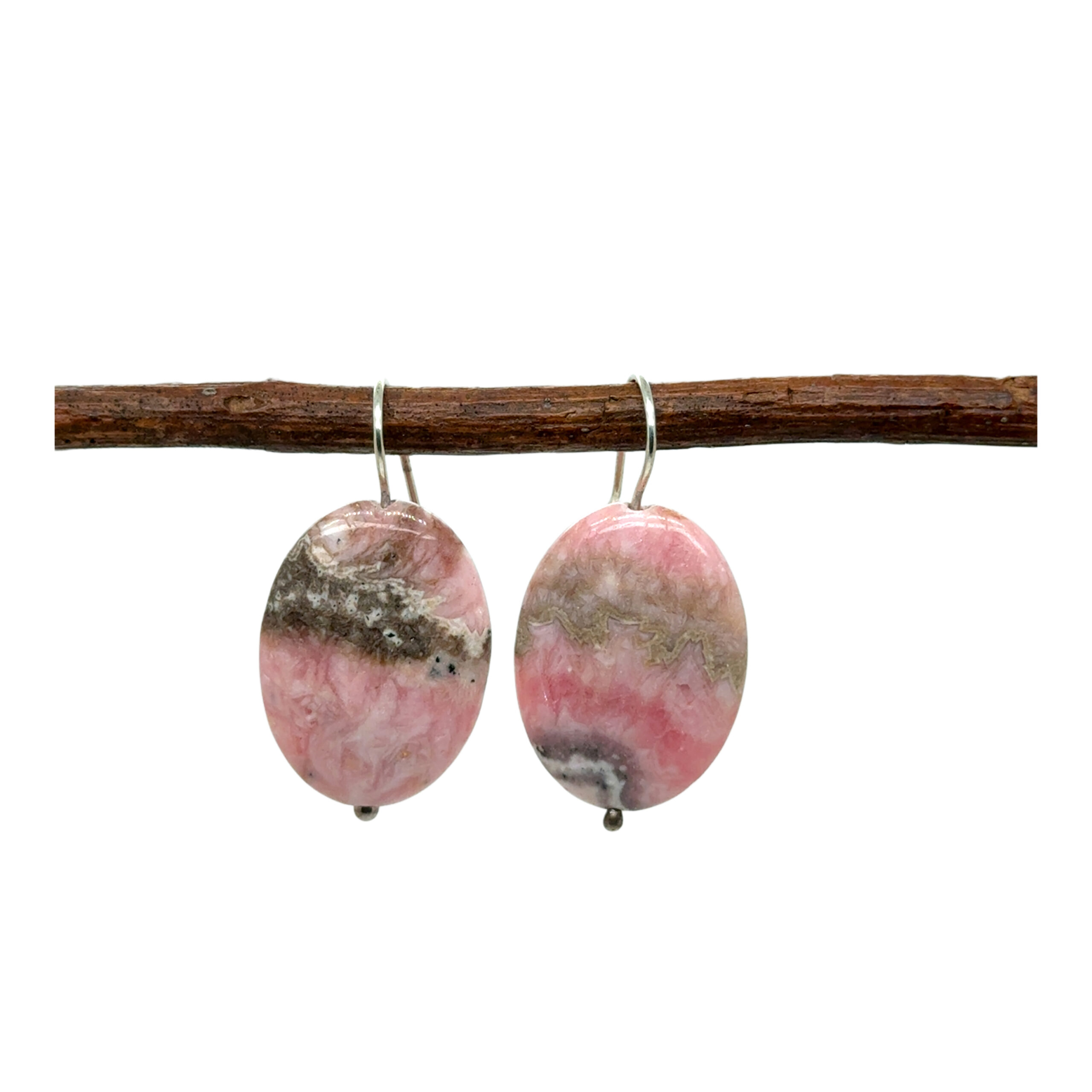 Oval shape rhodochrosite earrings on steering silver French style wires.