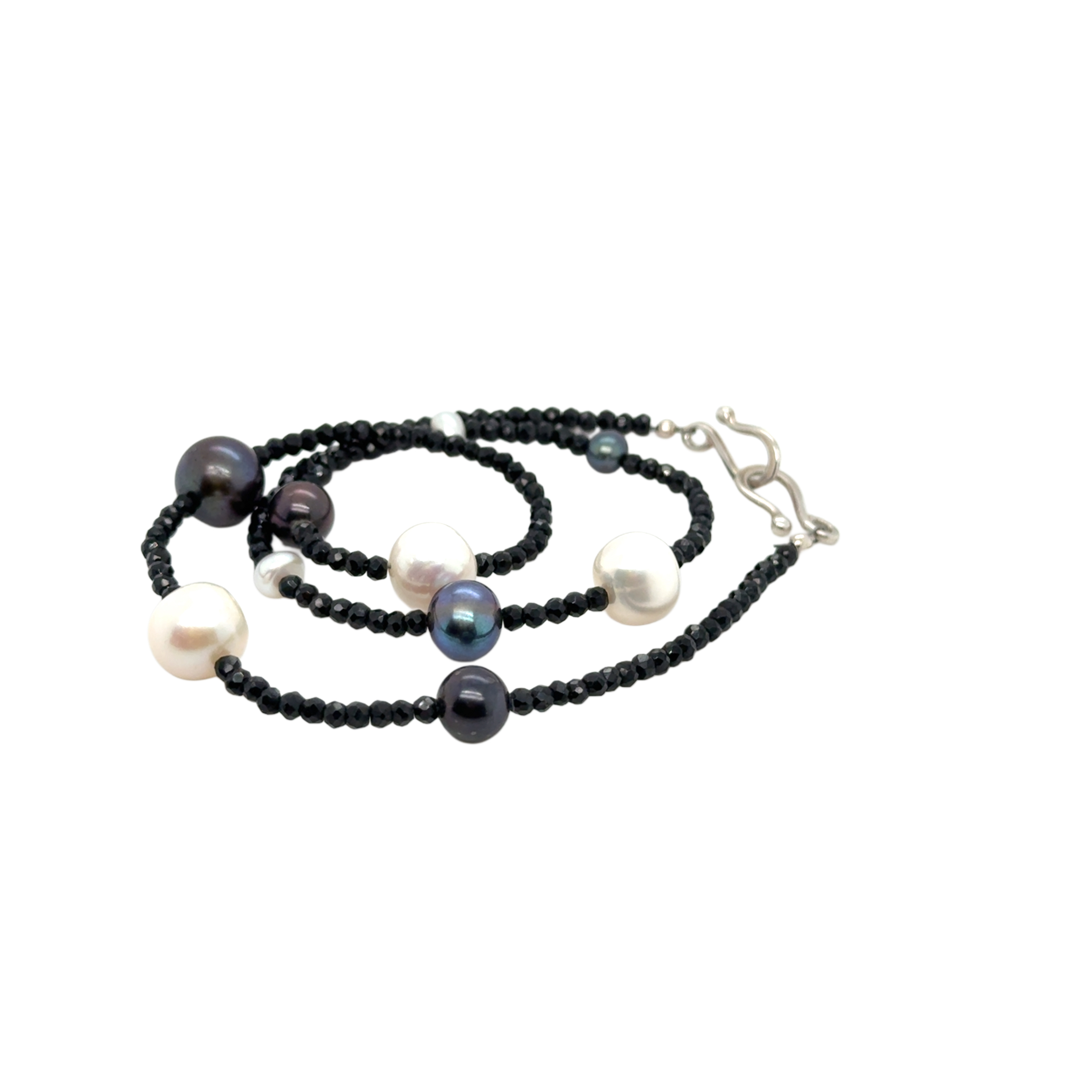 Round faceted black spinel with assorted fresh water pearls and a sterling silver s hook style clasp.