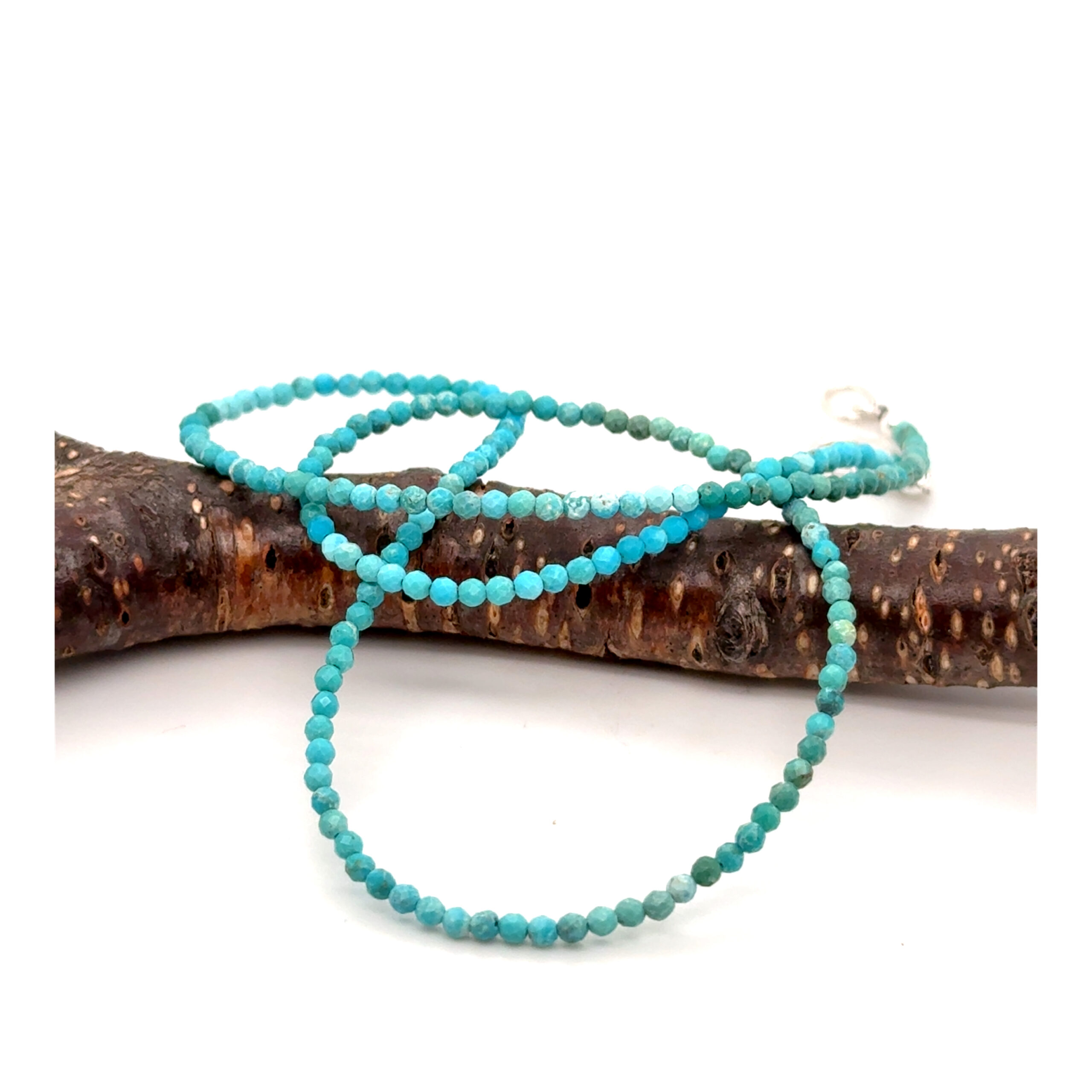 2mm round faceted turquoise rondells with a sterling silver lobster claw clasp.