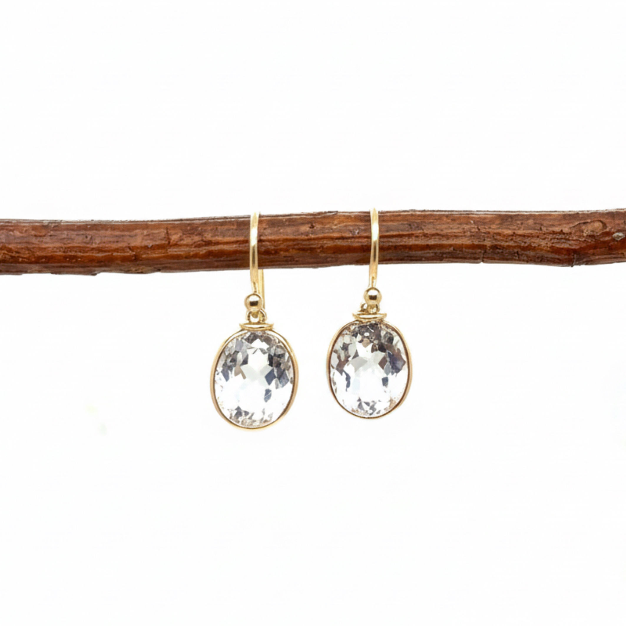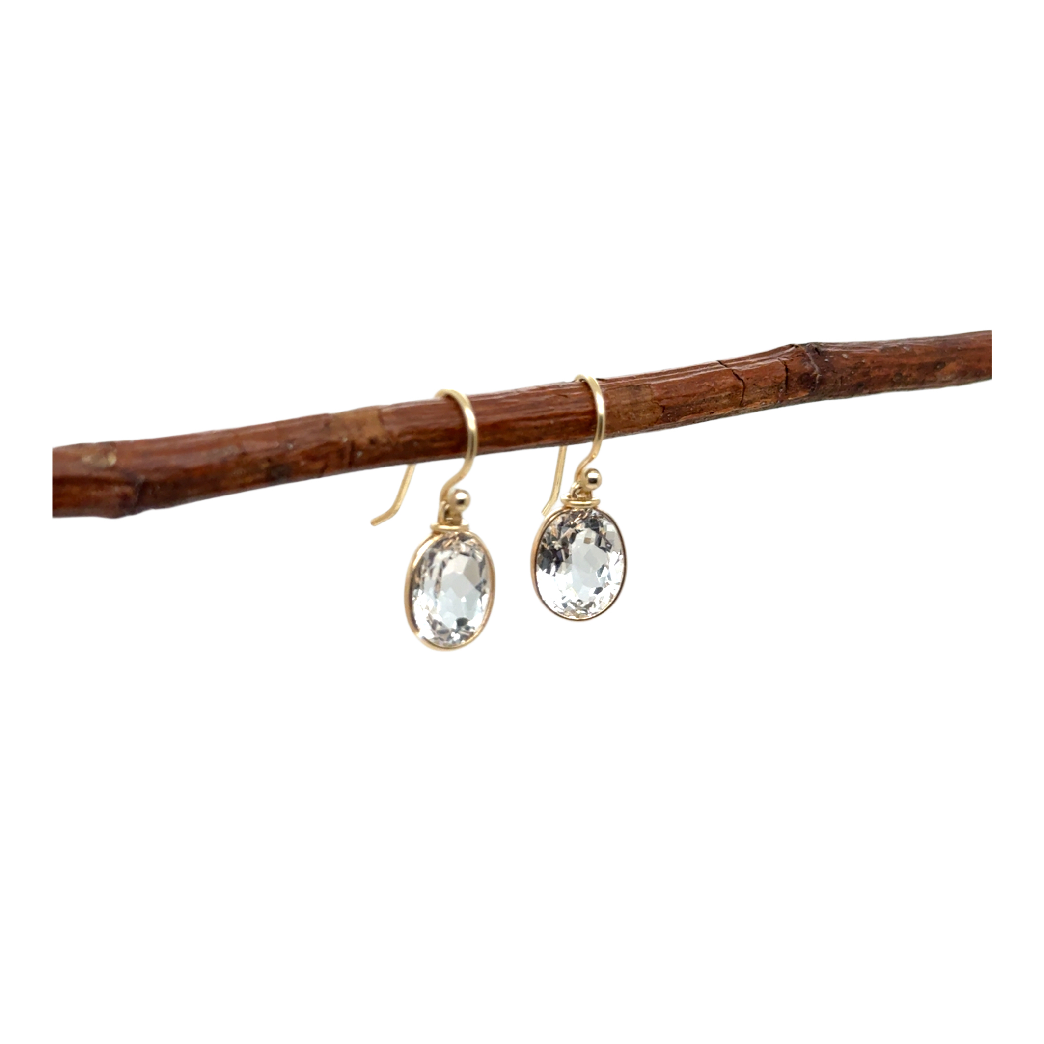 White topaz set in 14k yellow gold bezel with 14k yellow gold French style wires.