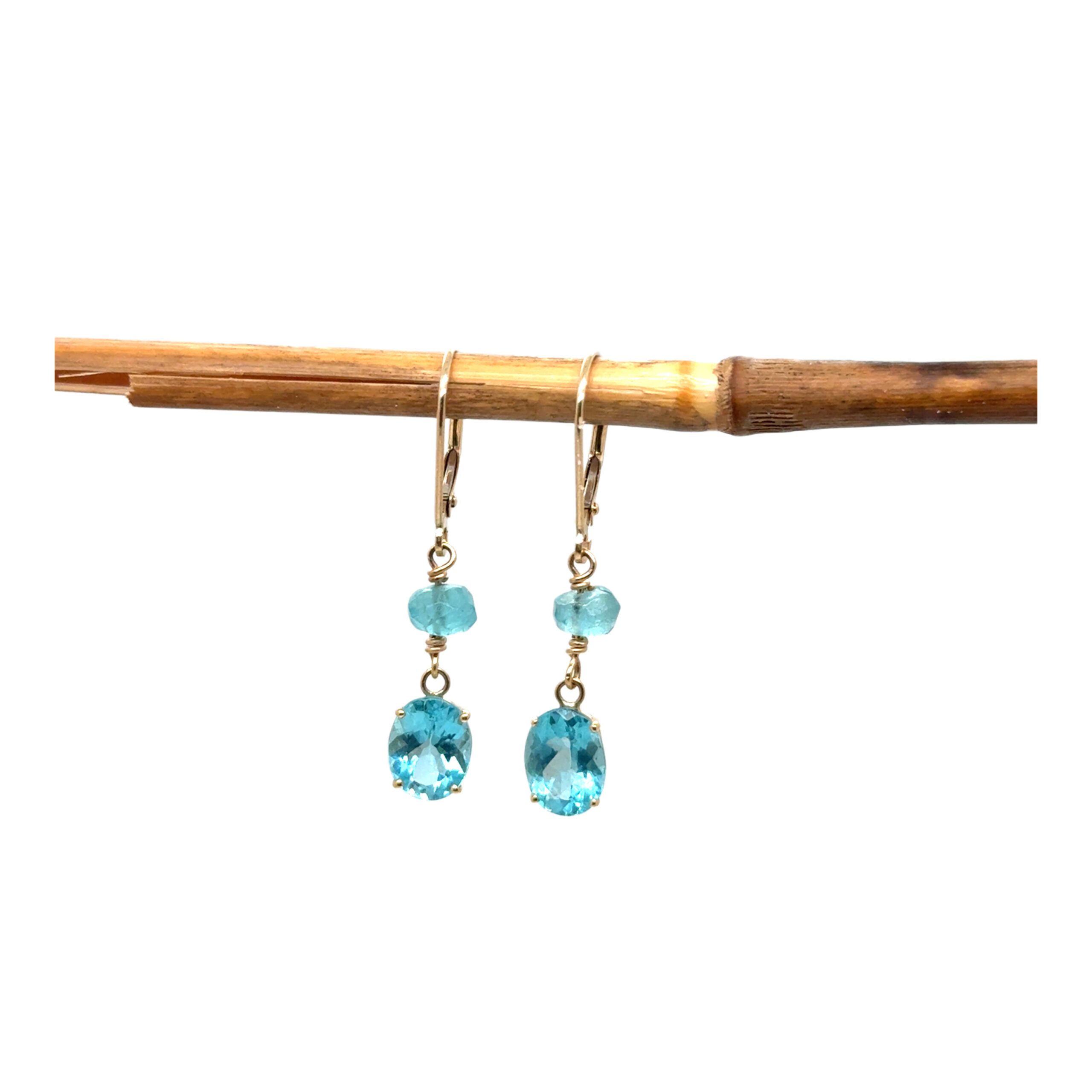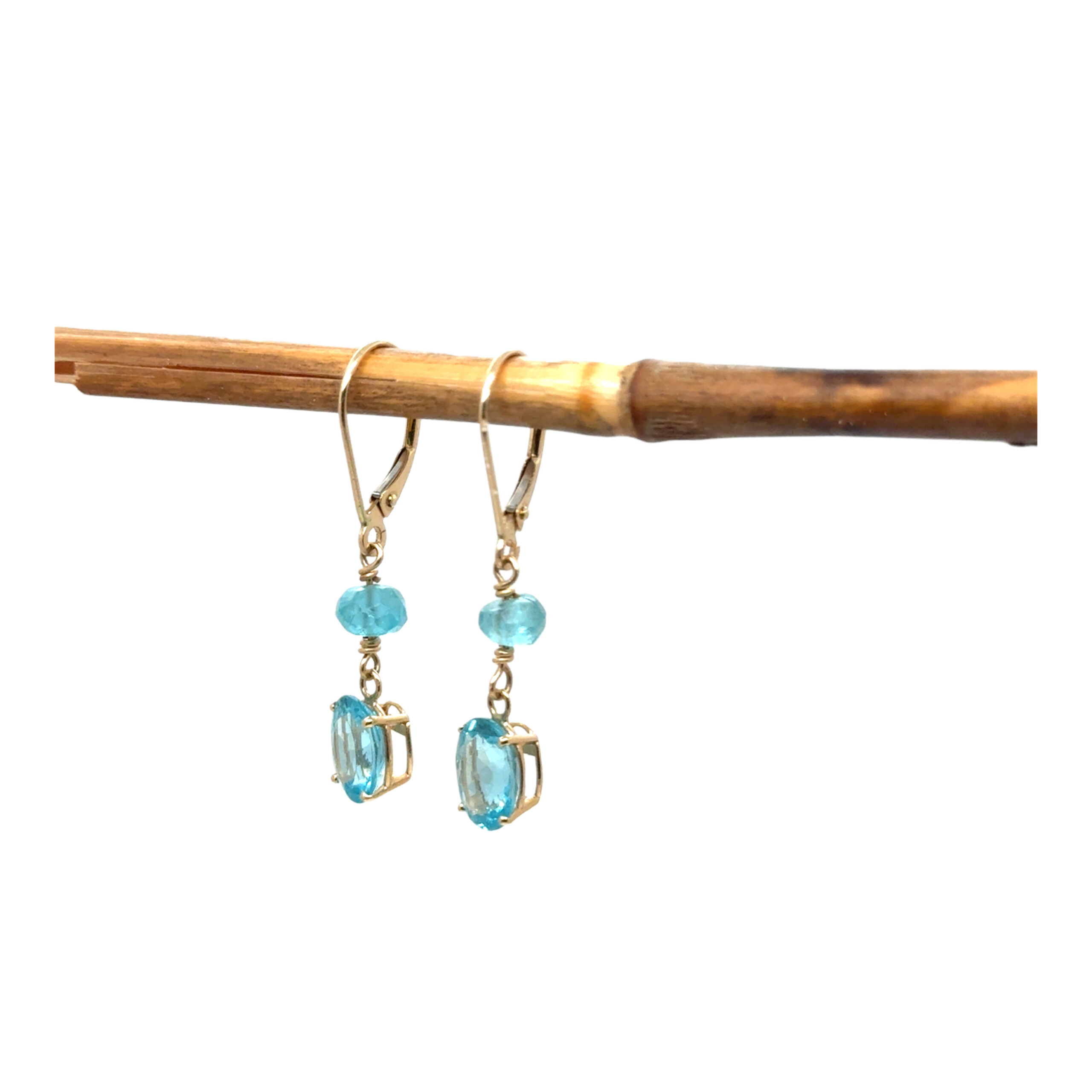3.00ct oval blue zircon with faceted apatite beads on 14k yellow gold wires with 14k yellow gold leverbacks.